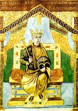 Charles the Bald Carolingian, King of Aquitaine, King of Italy, King of West Francia, Holy Roman Emperor, was born 823 in Frankfurt am Main, Hesse, Germany to Louis the Pious (778-840) and Judith of Bavaria (795-843) and died 877 Avrieux, France of unspecified causes. He married Ermentrude d'Orléans (830-869) 842 JL . He married Richildis de Provence (c845-910) 870 JL .