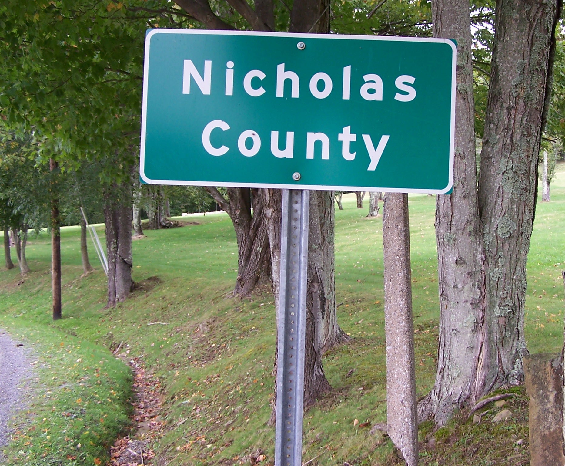 A highway sign designating the border between Nicholas and Greenbrier counties in West Virginia along a secondary road