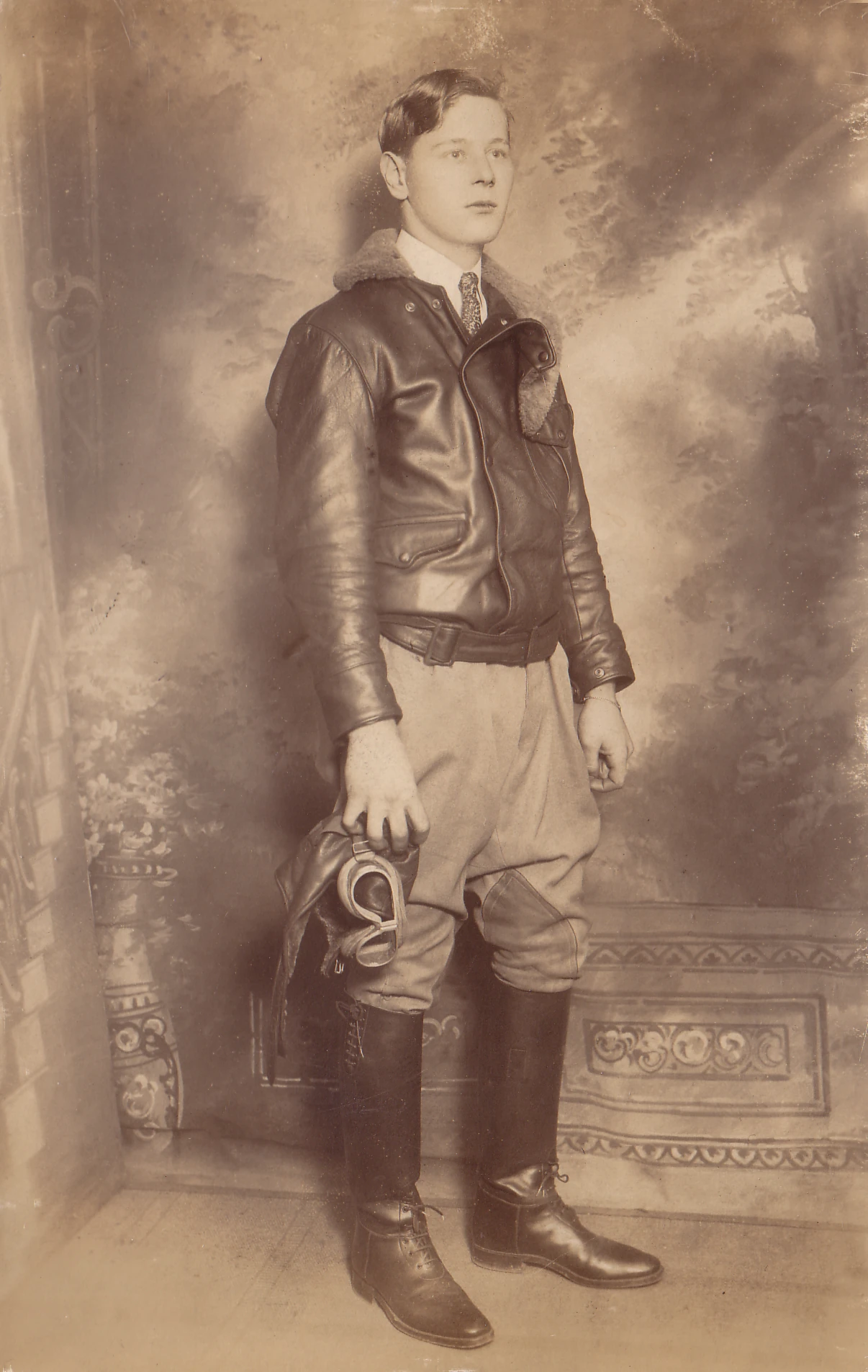 - 8 x 10 B&W portrait photo of Schneider standing in leather flight jacket, helmet and goggles holding a cigar.