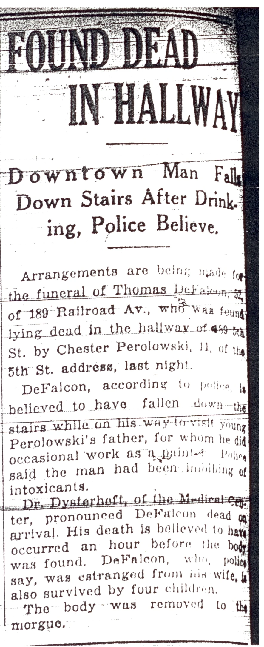 In 1937, Eva's daughter Lizzie was widowed, as her husband Anthony DeFalcon died after falling down the stairs to his employer's apartment on November 7, 1937. Anthony was believed to have been drinking, and his fall was not noticed until approximately an hour after he had already died. Lizzie remained a widow until the mid 1940s.