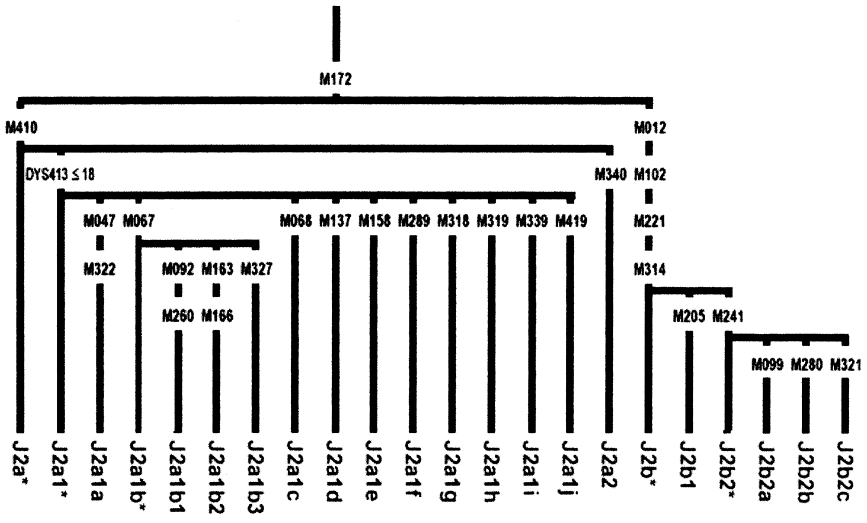The subclades of Haplogroup J2 with their defining mutation, according to the 2006 ISOGG tree:
