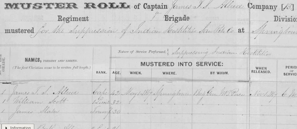 Company of Utah Territorial Militia organized in from residents of Spring City, Sanpete County, Utah in 1867 to "suppress indian hostilities". Led by James Tillmon Sanford Allred (1825-1905). James was the Captain and his son Nephi was listed along with many other family members from Springtown.