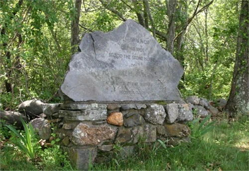 Inscription on stone says: "A FEW RODS WEST OF THIS SPOT STOOD THE STONE HOVSE OF JIREH BVULL BURNED BY THE INDIANS DECEMBER 15, 1675." This marker is beside the approach to Middle Bridge over Narrow River. The site of the house is on private property. --From Gates family tree