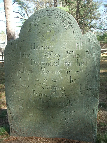 "In Memory of Mr. John Alden Who was Drownded on his passage November ye 17th 1766 as he was Coming From Casco Bay to Duxborough in ye 22nd year of his Age"