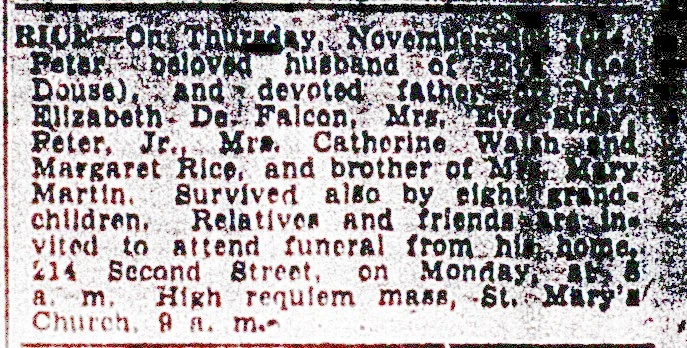 Margaret's father Peter died November 30, 1944 in Jersey City, New Jersey, at age 65. Peter's funeral was held at Saint Mary's church, on Second Street in Jersey City.
