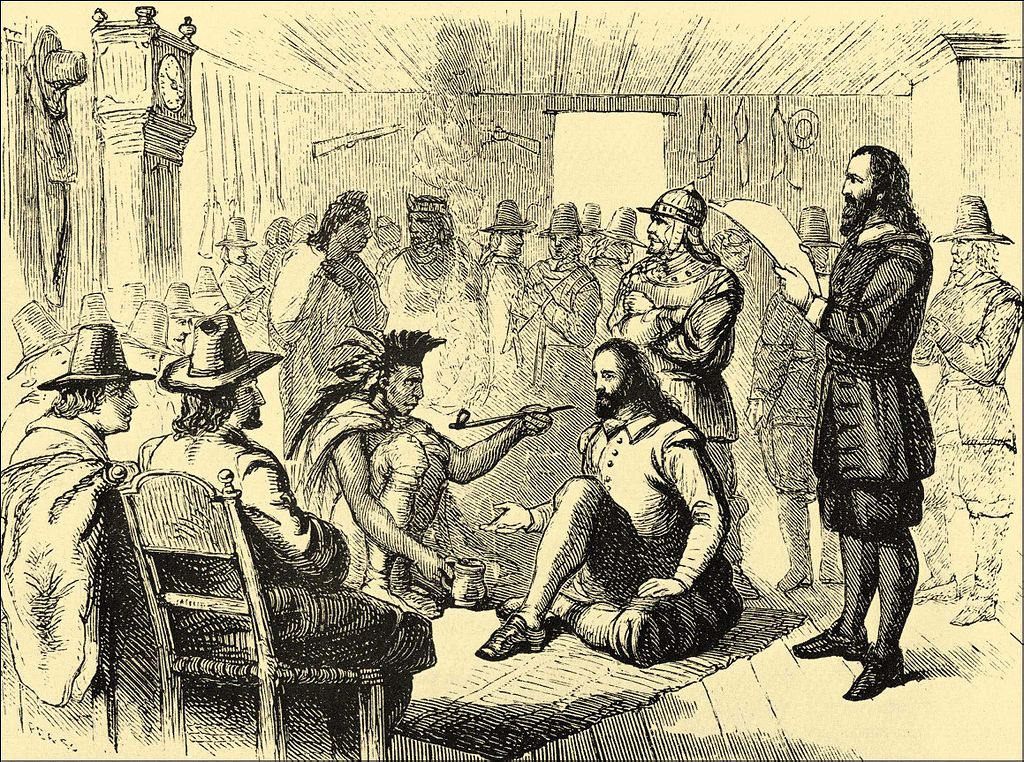 Massasoit smoking a ceremonial pipe with Governor John Carver in Plymouth 1621.