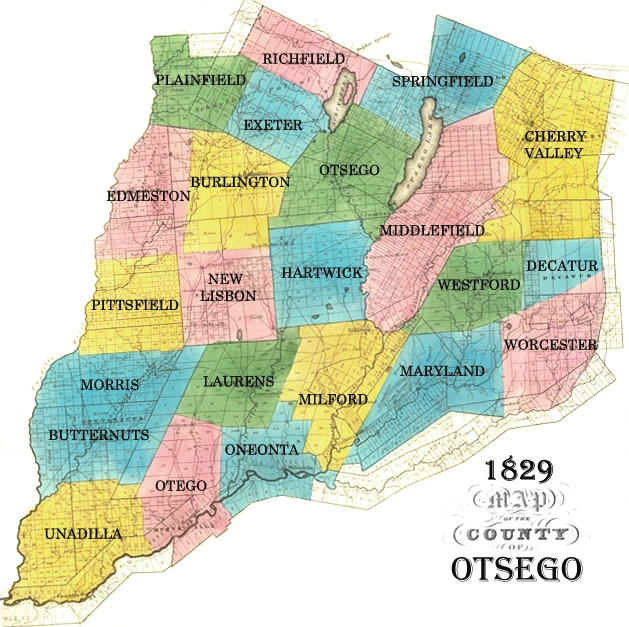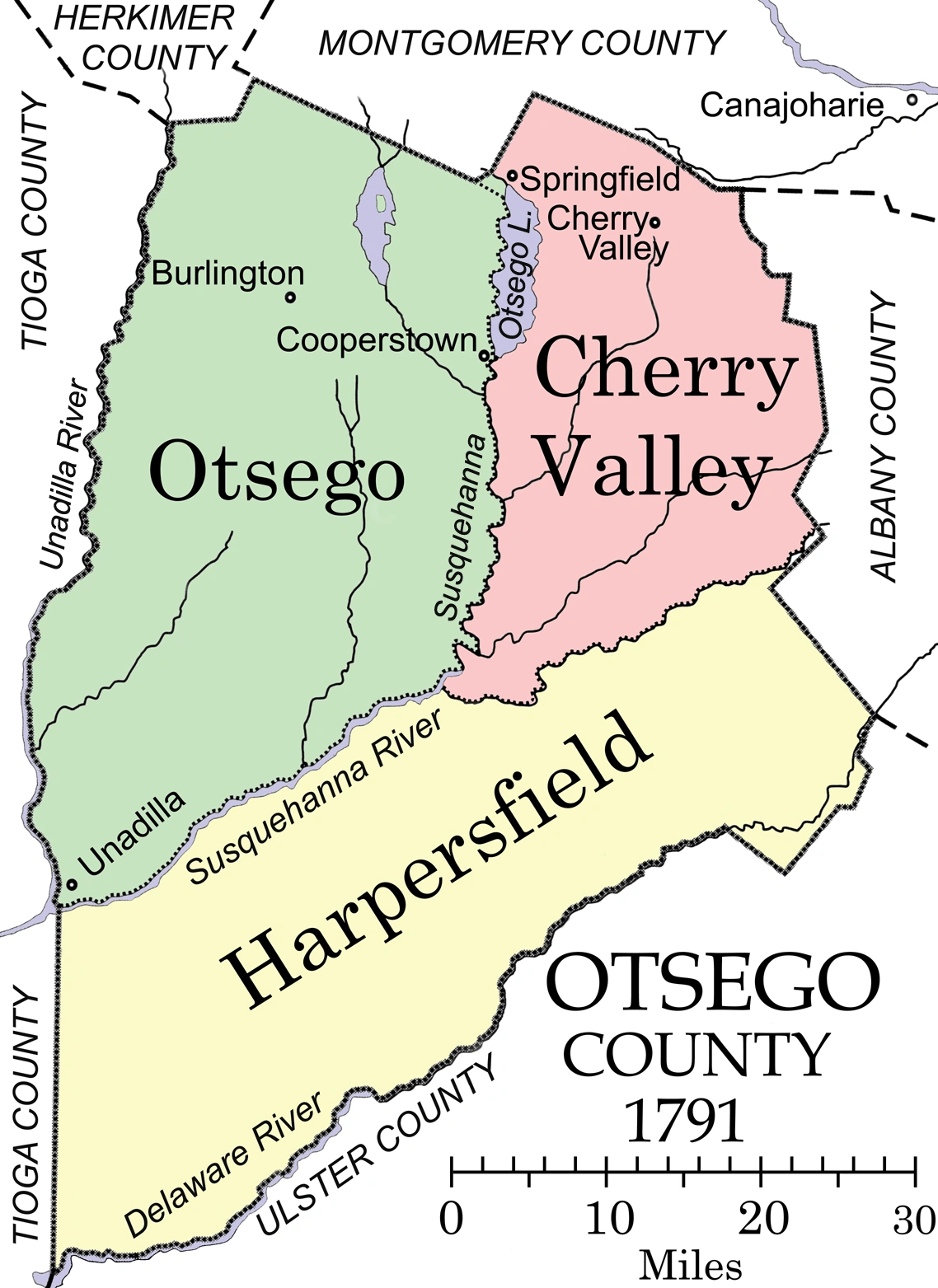 Otsego and Cherry Valley together roughly covered the area of modern Otsego County, while Harpersfield covered the area south of the current county as far as the Delaware River.
