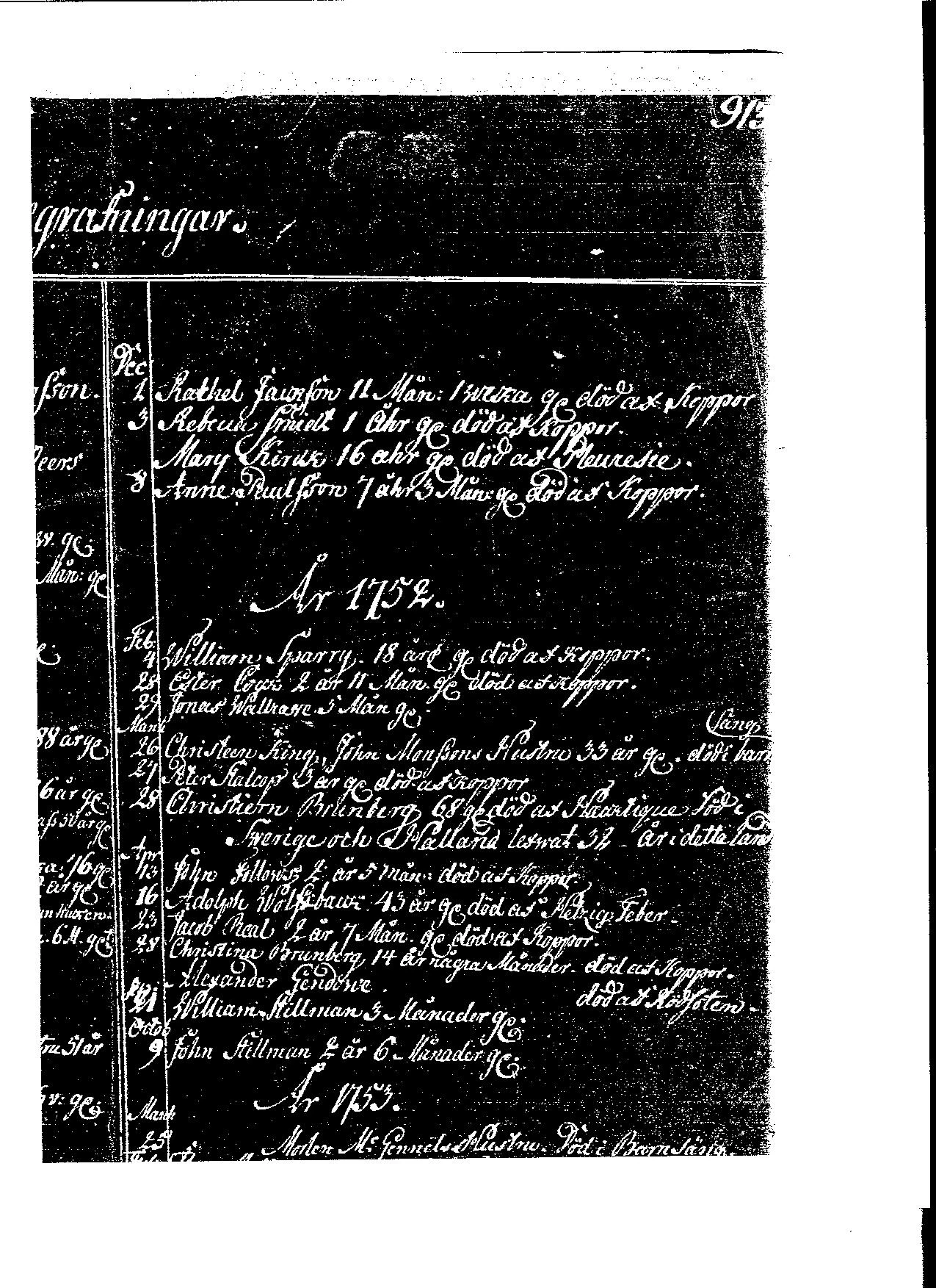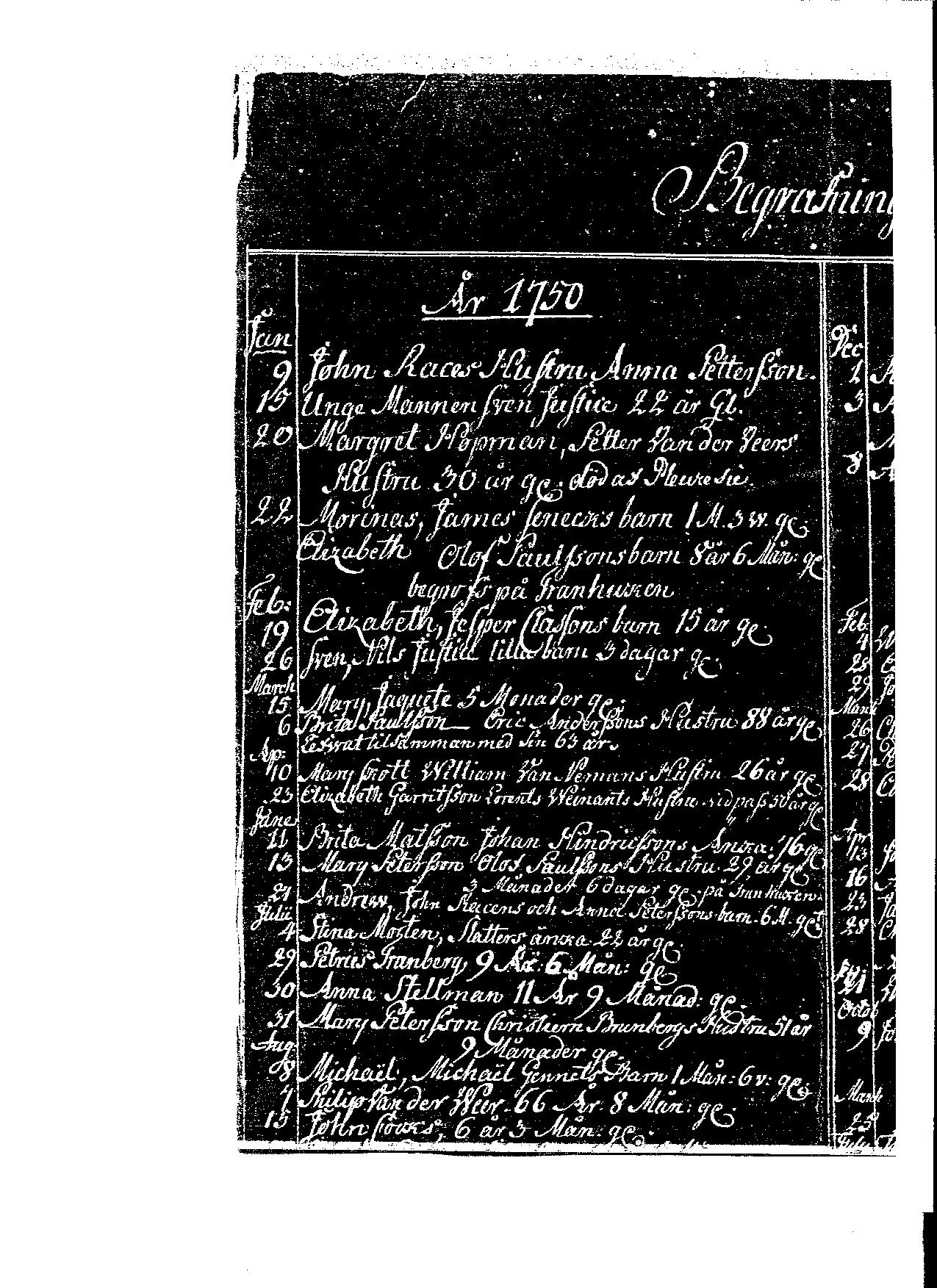 - 9. Christina Brunberg, born 20 Jan. 1738, buried 28 April 1752 at age of 14, smallpox. She died within a month of her father and her death is recorded beneath that of her father (see above)