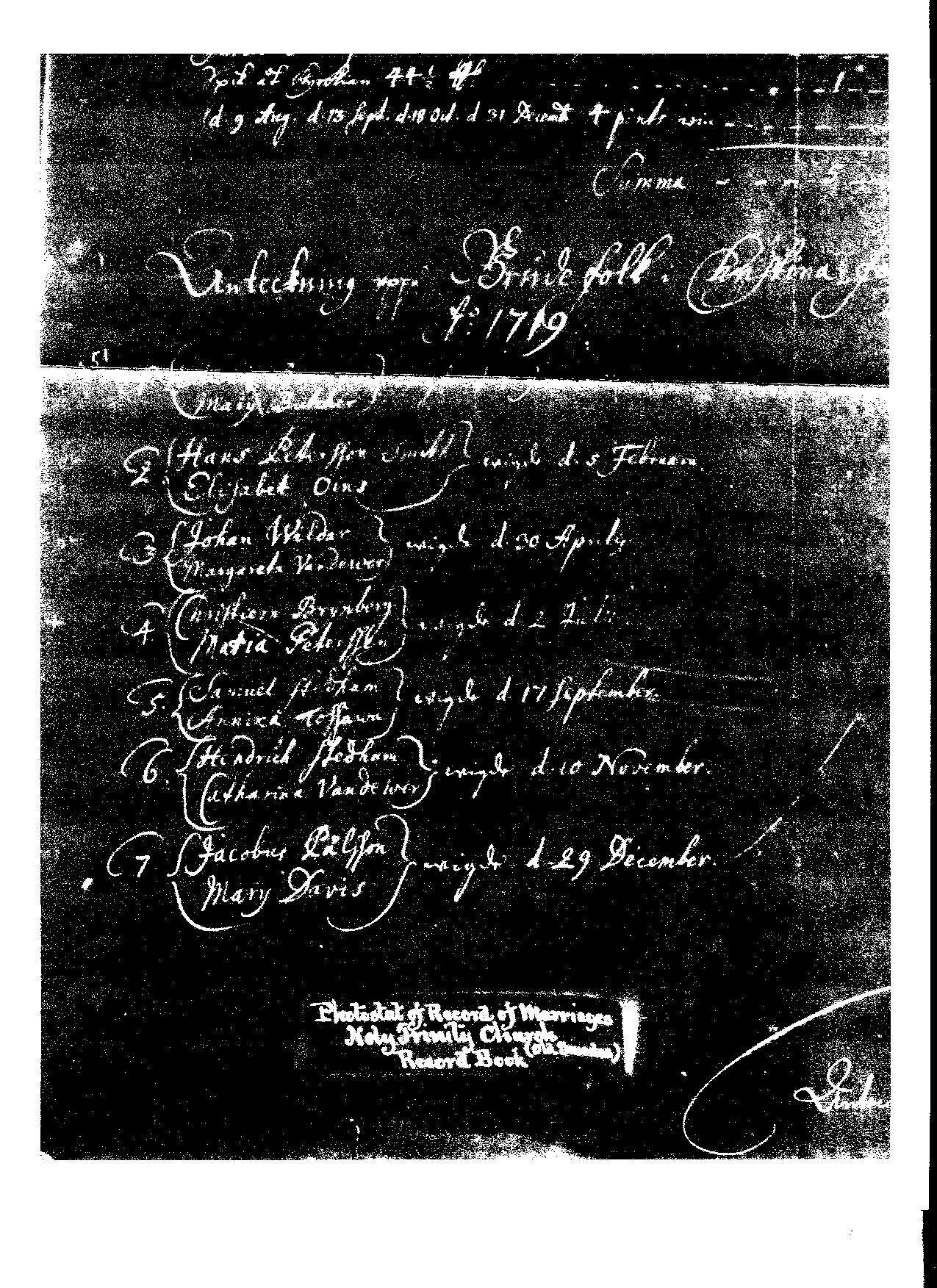 #2-3. Matthias Brimberry's parents, Christiern Brunberg and Maria Peterson were married at Holy Trinity Church on 2 July 1719.