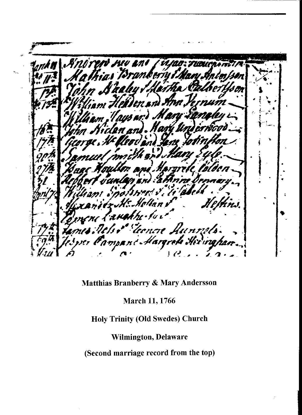 It is also noteworthy that 19th century Swedish churchman and historian Israel Acrelius in writing about the Swedes on the Delaware in 1693 mentioned several arrivals who came in later times, including Brunberg. Suffice that Christiern Brunberg was active and prominent in the affairs of Holy Trinity Church following his marriage in 1719 to Maria Petersson, who subsequently became the progenitors of the Brimberry family in the United States. However, only one of their three sons, Matthias, the youngest, had male lines to carry on the name.