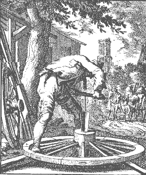 Church records and his last will and testament also reveal the names of Christiern's children and their spouses. We also know that he died at the age of 68 following a "haartique" and that his will devised that his youngest son, Matthias, then 16, be "lett out" to a trade. As it turned out, the trade was wagon-making, a craft which Matthias in turn handed down to his oldest son, Peter, and in turn to his grandson and namesake, Matthais, this writer's male ancestors. The above engraving depicts a wagon maker boring a hole for an axle, a task that the first Matthias Brymberry and his son Peter and grandson Matthias would have often performed.