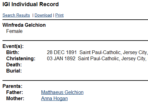 Winifred was baptised on January 03, 1892 at Saint Paul's Roman Catholic Church at 14 Greenville Avenue in Jersey City and her godparents were: Joanne Yore; and Margaret Hogan, her maternal aunt. Her parents were listed as "Anna Hogan" and "Matthew Gelchion".